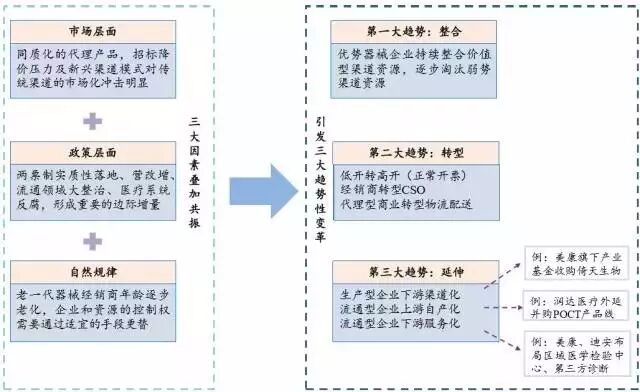 这种变革主要体现在三个方面:整合(优势器械企业持续整合价值型渠道)、转型(器械渠道环节内部业务模式发生转变)、延伸(以渠道为纽带,医疗器械产业链各环节之间相互延伸、渗透)。